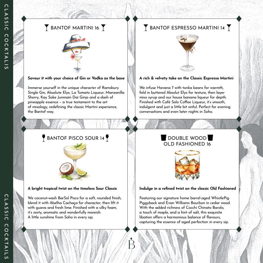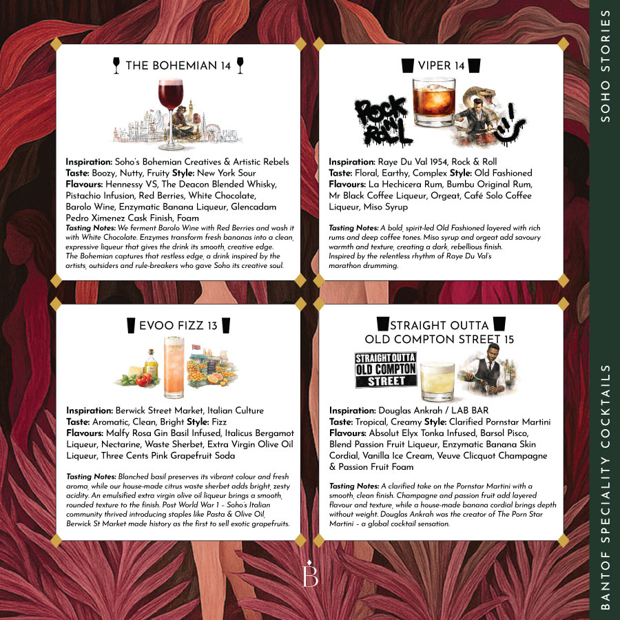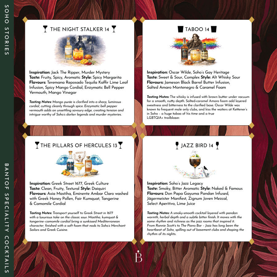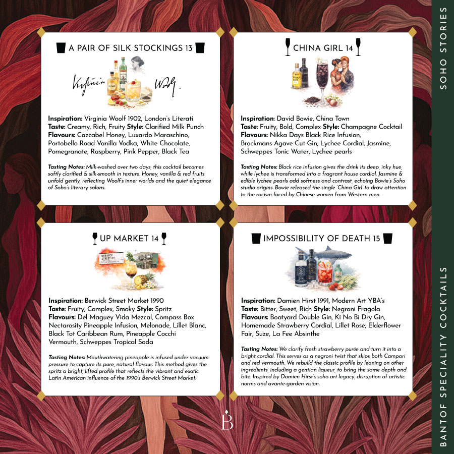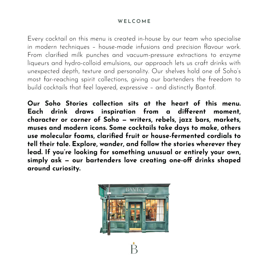 Our Soho Stories collection sits at the heart of our cocktail menu, with each drink drawing inspiration from a different moment, character, or corner of Soho – writers, rebels, jazz bars, markets, muses, and modern icons.